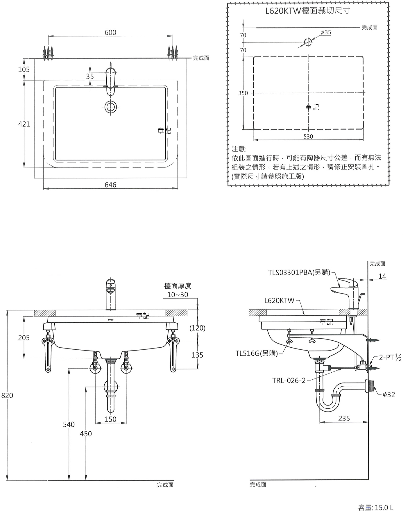 TOTO 下嵌檯面盆(65cm) L620KTW 尺寸圖