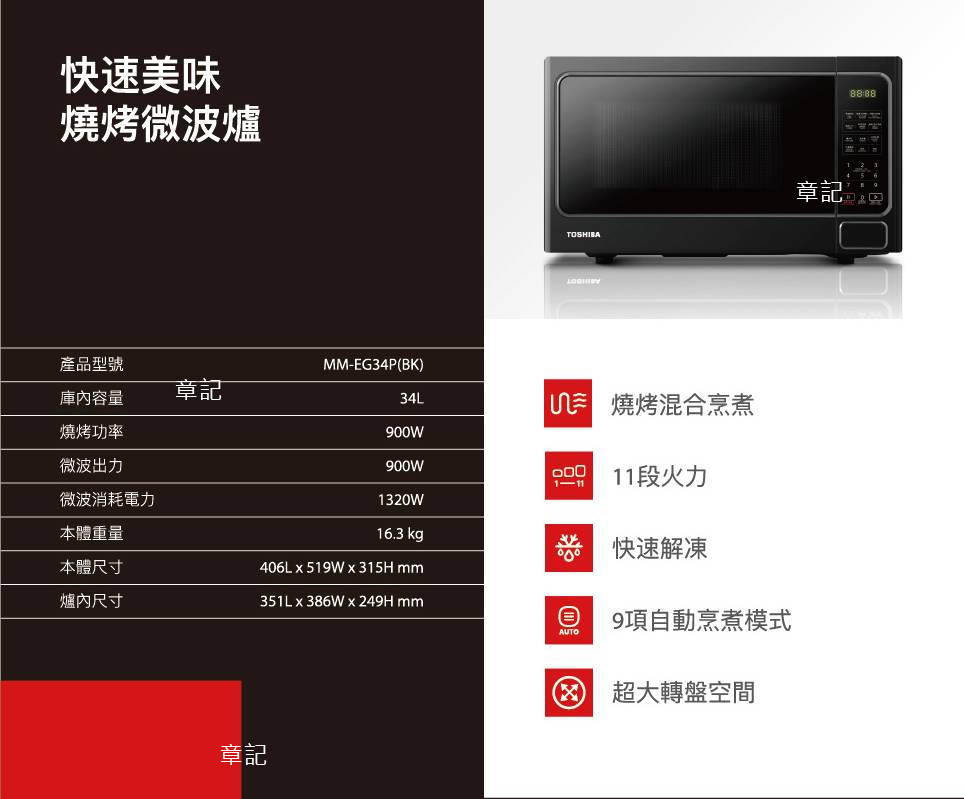 現在訂購TOSHIBA東芝 燒烤料理微波爐 MM-EG34P(BK),全省免運費宅配到府!
