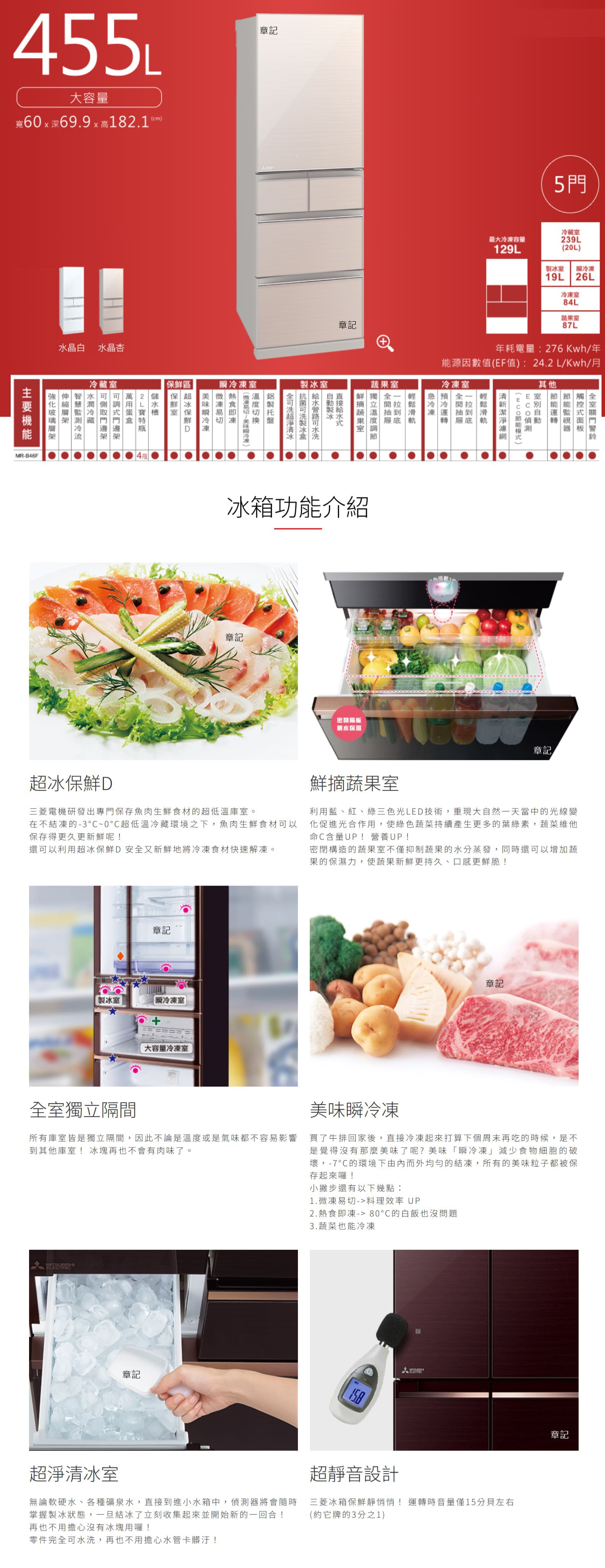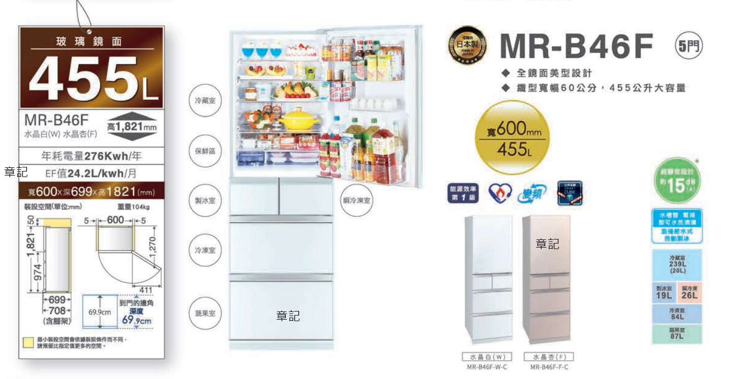 總容量:455L (冷藏室239L、冷凍室84L、蔬果室87L、製冰室19L、瞬冷凍26L)