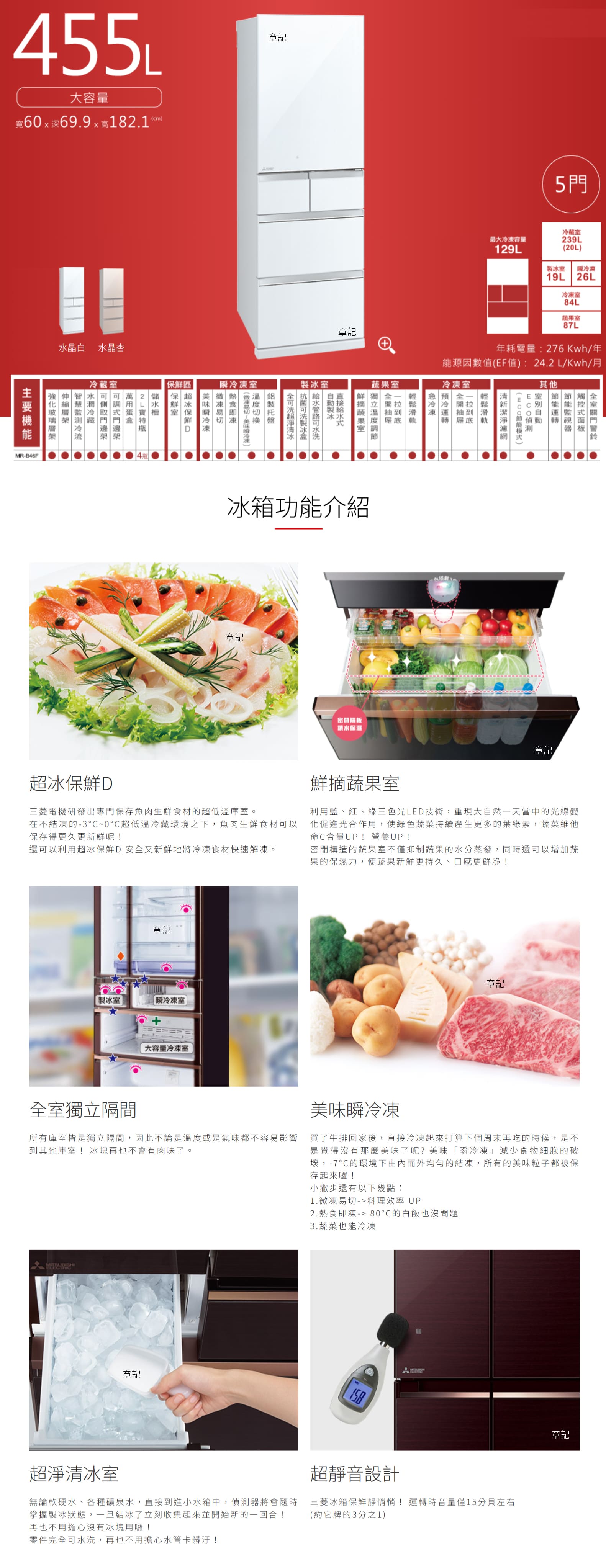 總容量:455L (冷藏室239L、冷凍室84L、蔬果室87L、製冰室19L、瞬冷凍26L)