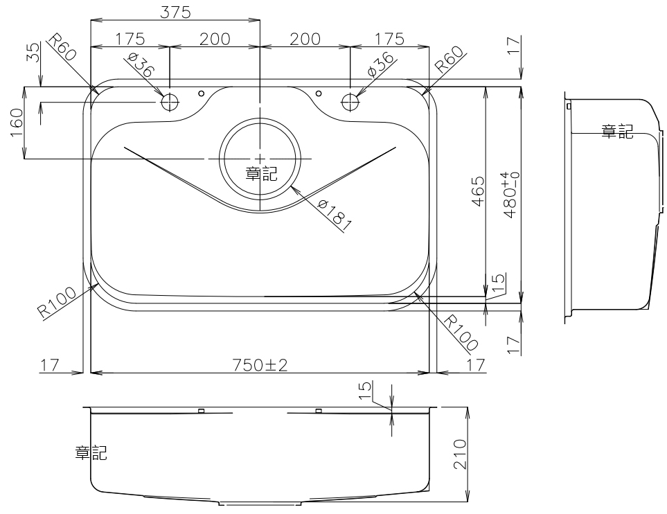 日本TOYOURA 不鏽鋼壓花水槽(75x48cm) N750BIA-EB 尺寸圖