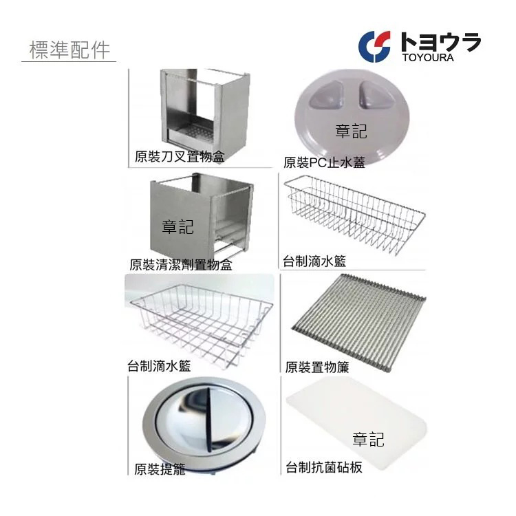 標準配件:日本瀝水置物簾、刀叉置物盒、清潔劑置物盒、台製清潔籃、大&小滴水籃、日本原裝提籠組、PC止水蓋。