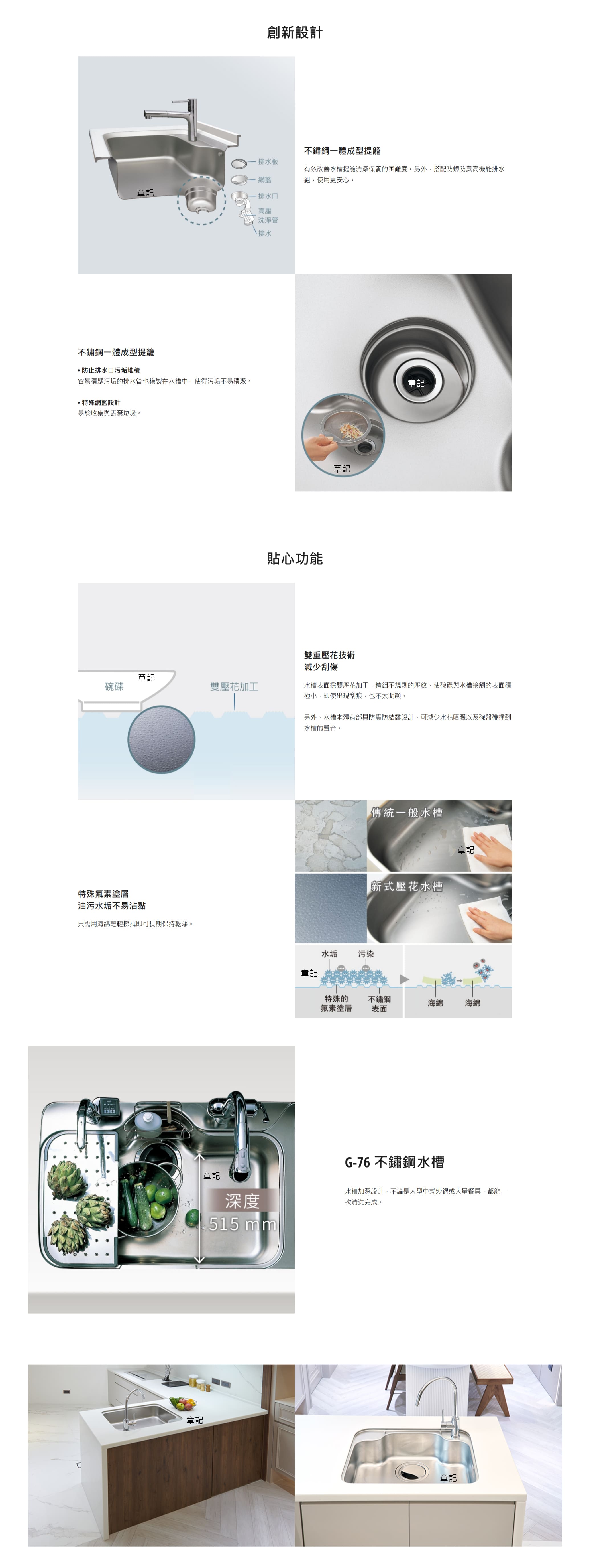 標準配件:不鏽鋼瀝水籃、不鏽鋼置物籃、止水蓋、大濾網、防蟑排水管