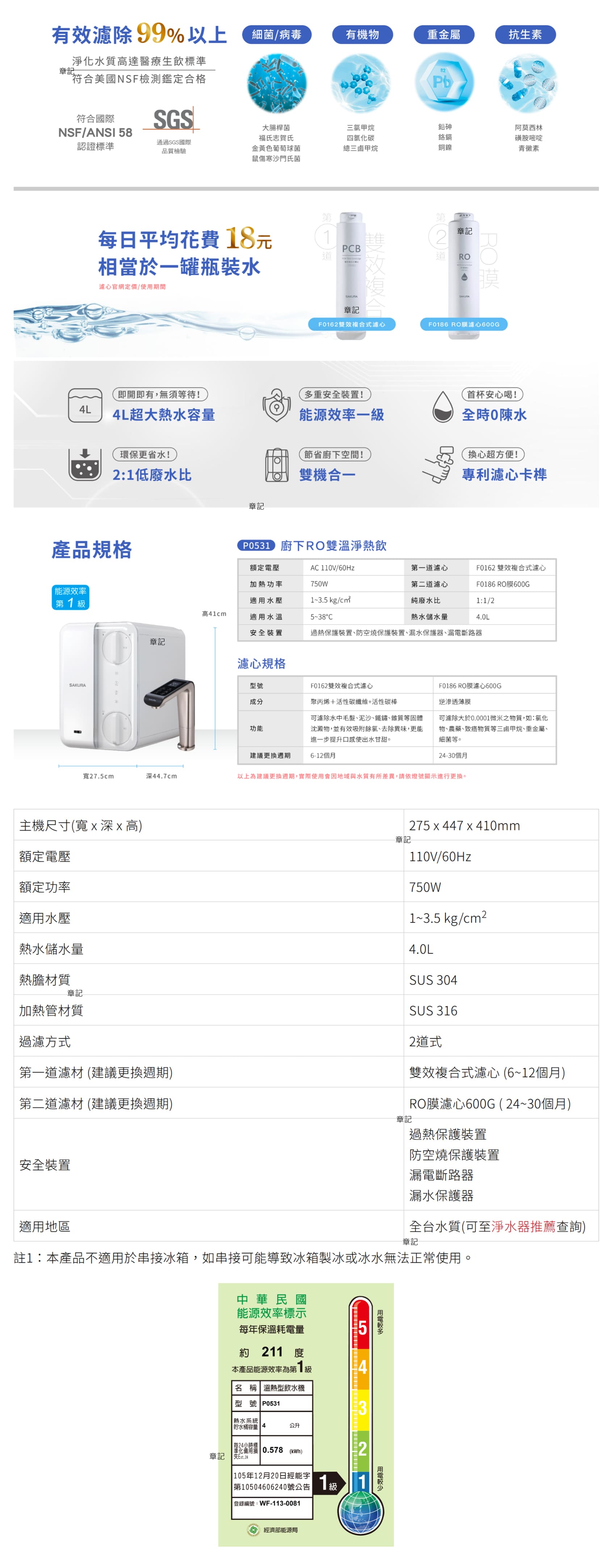 櫻花牌(SAKURA)廚下RO雙溫淨熱飲 P0531 規格