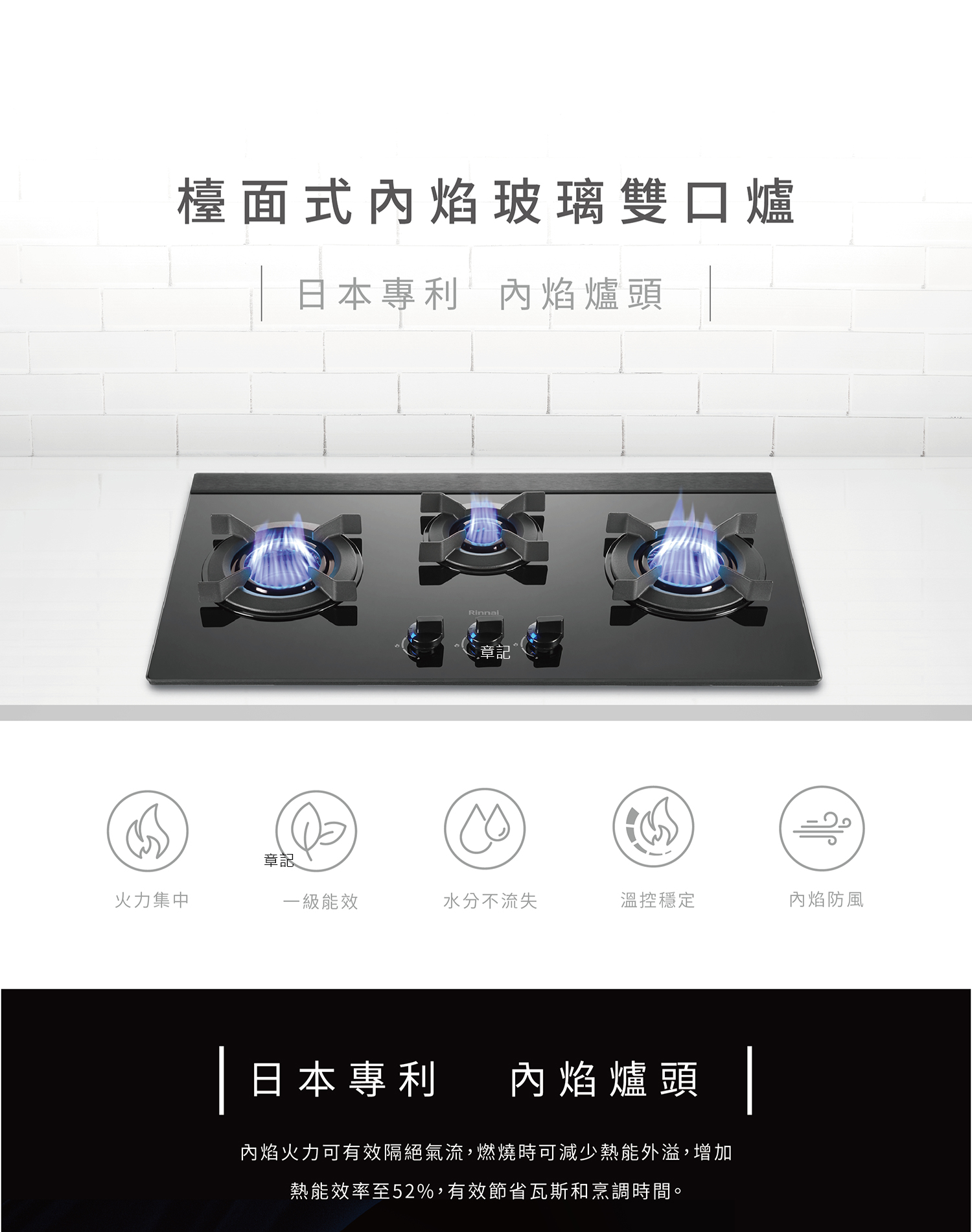 林內牌(Rinnai)檯面式內焰玻璃三口爐 RB-N3811G(B)