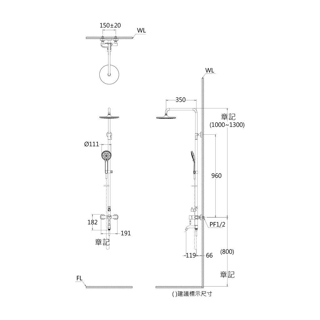 凱撒(CAESAR)不鏽鋼淋浴柱 S1028S 尺寸圖