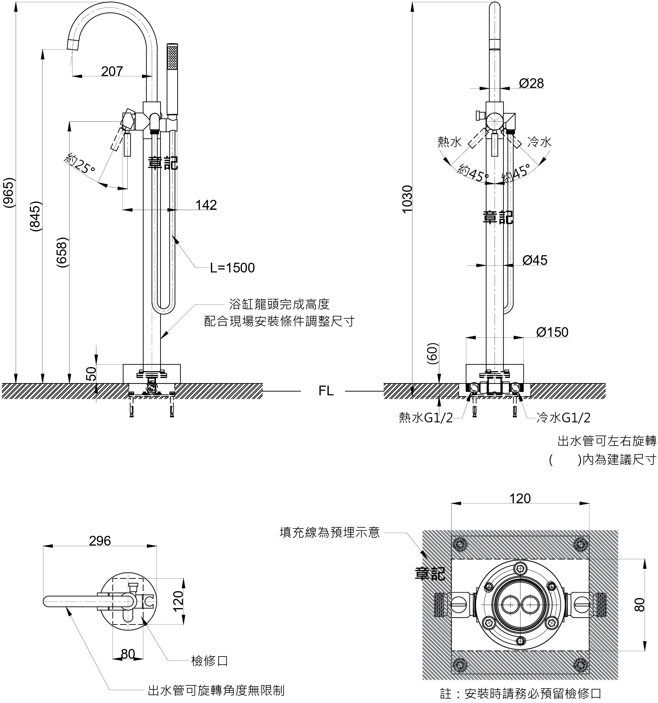 OVO 落地式浴缸龍頭 S2012 尺寸圖