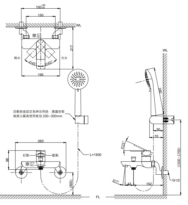 OVO 不鏽鋼沐浴龍頭組 S8065 尺寸圖