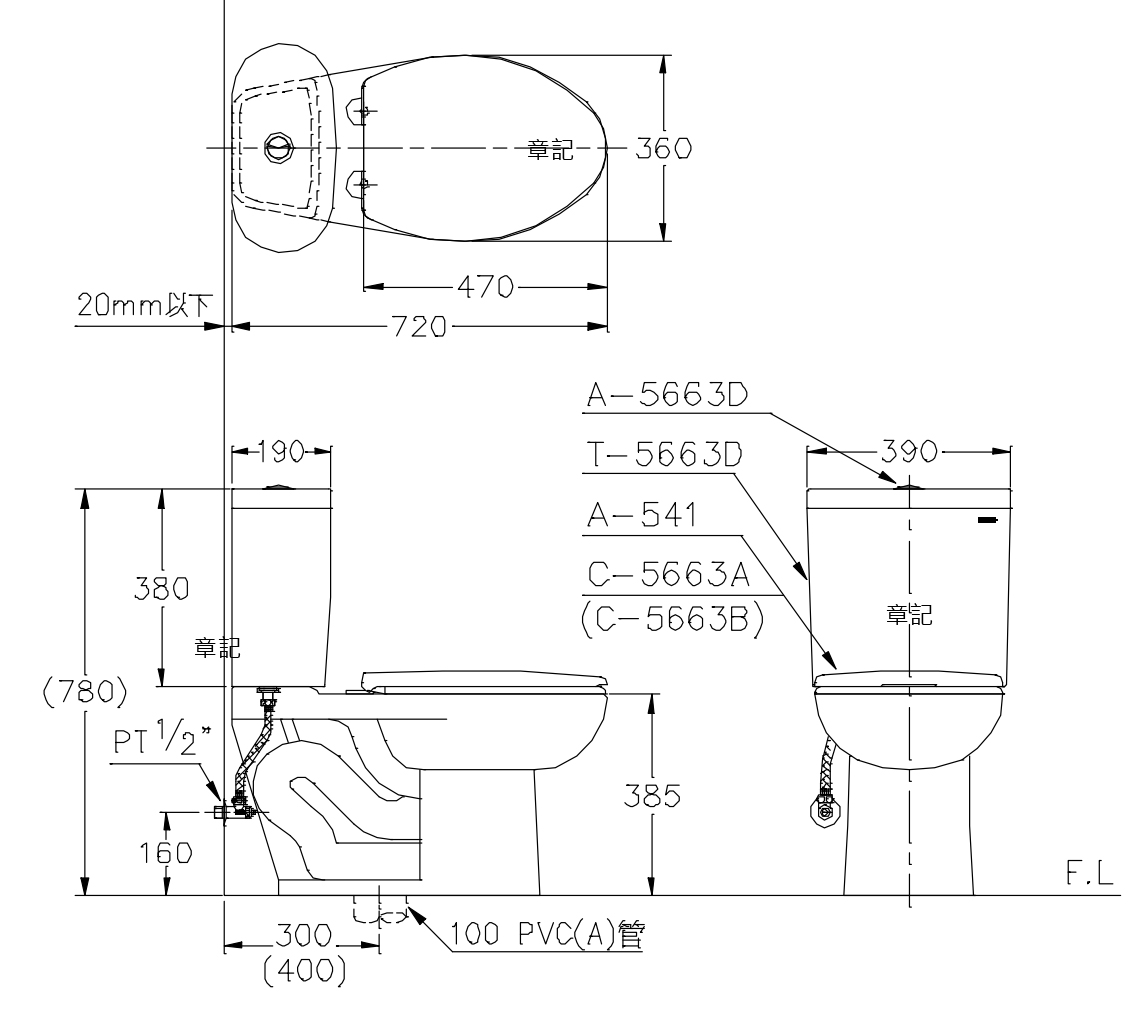 電光牌(TENCO)兩段式馬桶 SC5663AD-T 尺寸圖