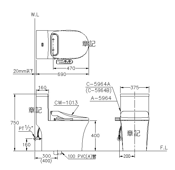 電光牌(TENCO)二段式單體馬桶附潔屁電腦馬桶座 SC5964A-TE8 尺寸圖