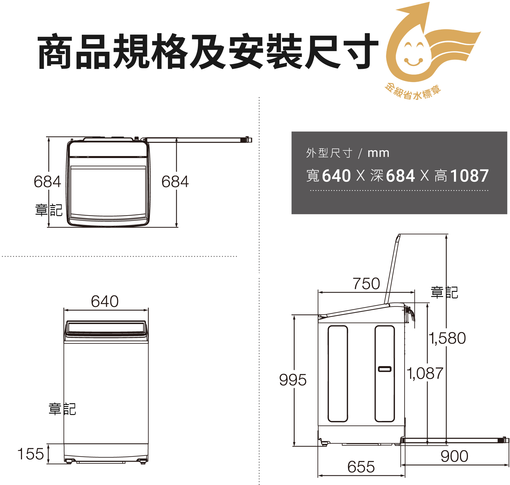 HITACHI日立直立式洗衣機 SF150ZHV 尺寸圖