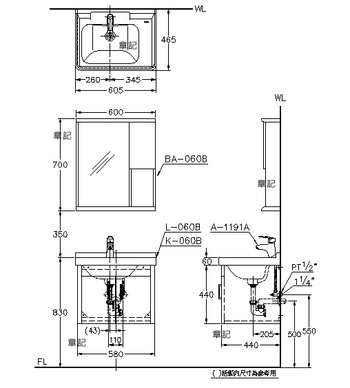 電光牌(TENCO)浴櫃盆及鏡櫃組(不含龍頭) SK060BB-W1 尺寸圖