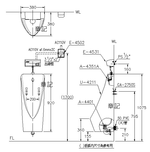 電光牌(TENCO)小便斗電沖設備 SU4211-R 尺寸圖