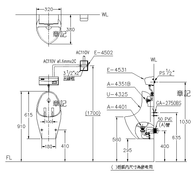 電光牌(TENCO)掛式小便斗電沖設備 SU4325-R 尺寸圖