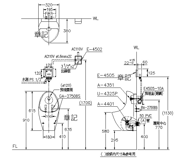 電光牌(TENCO)小便斗電沖設備 SU4325P-CP 尺寸圖