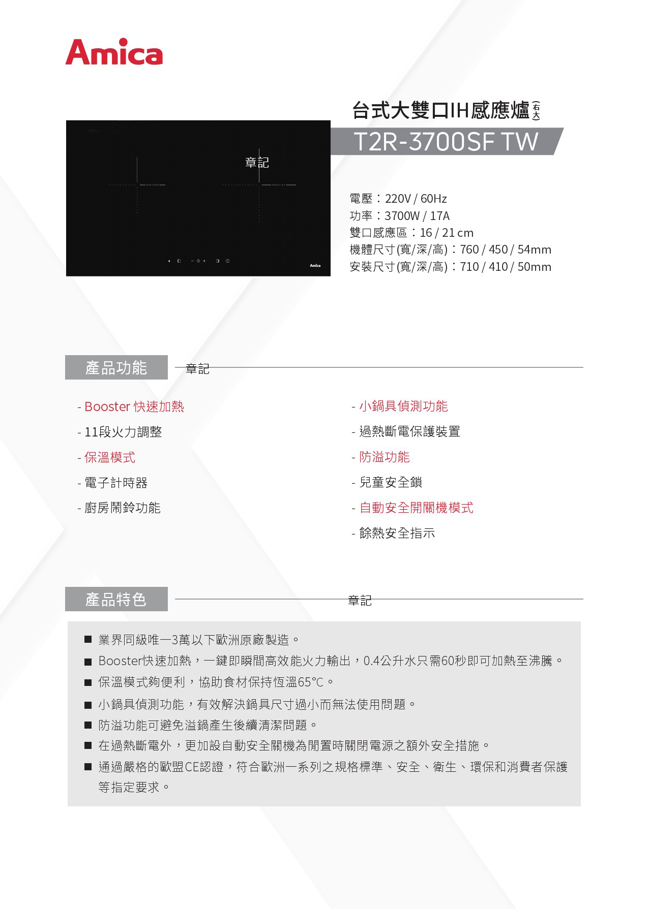 Amica 台式大雙口IH感應爐 T2R-3700SFTW