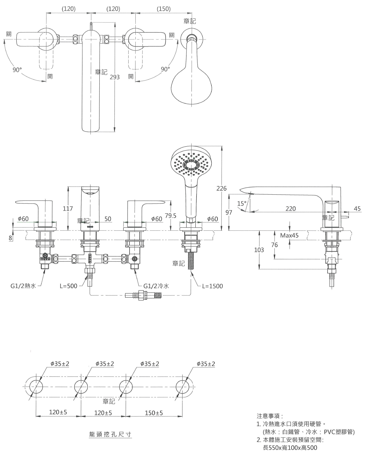 TOTO 四件式缸上型龍頭 TBG04202PA 尺寸圖