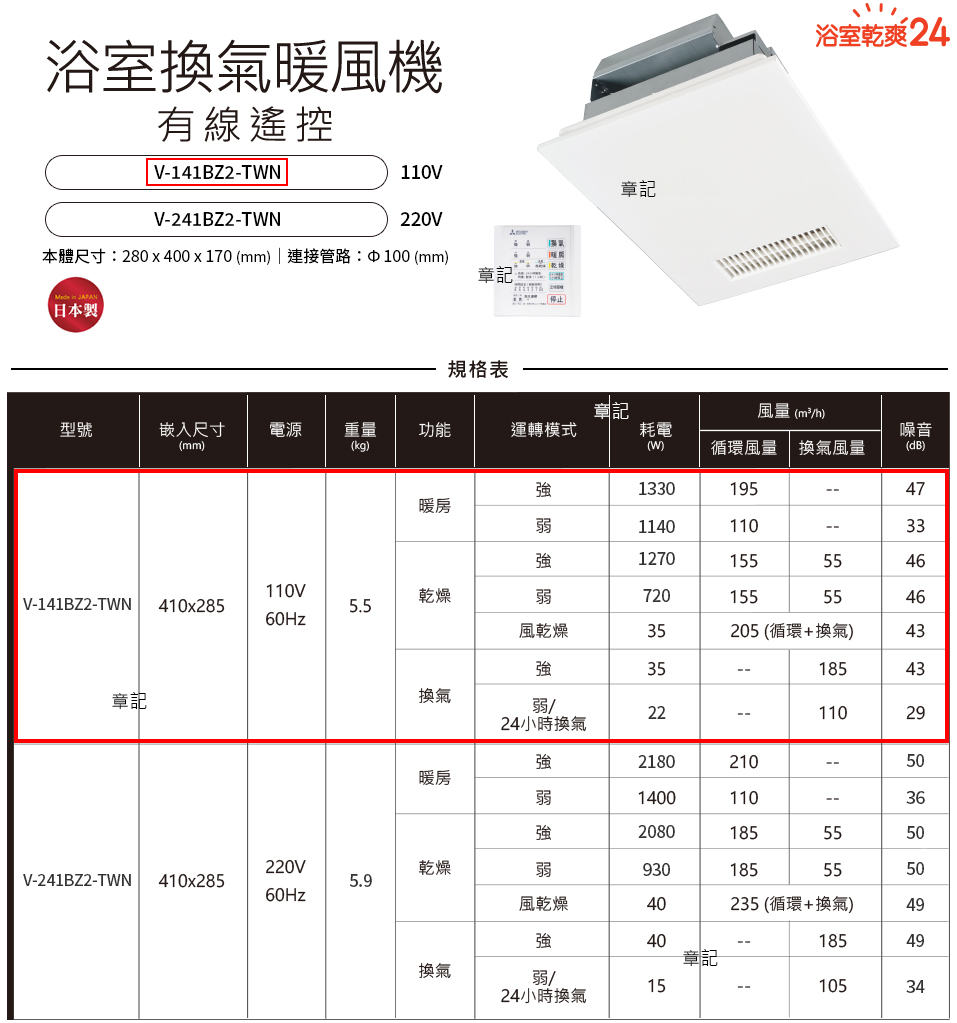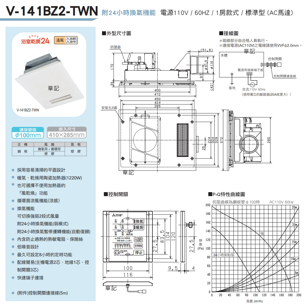 三菱(MITSUBISHI)超靜音暖房換氣機(110V/線控) V-141BZ2-TWN