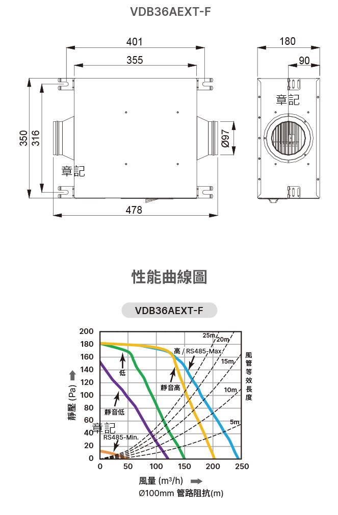 台達(DELTA) 全室淨化新風機 VDB36AEXT-F 尺寸圖
