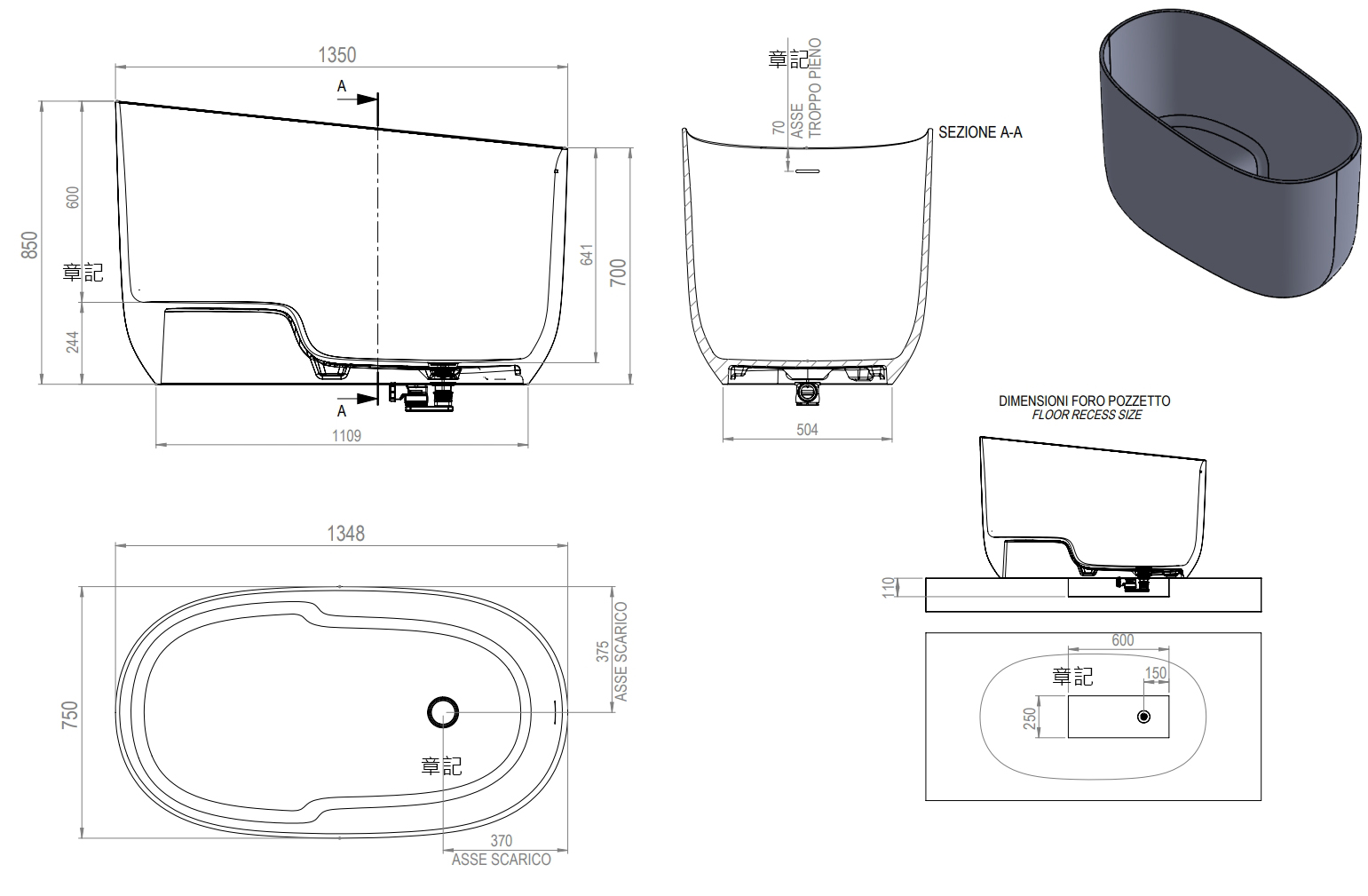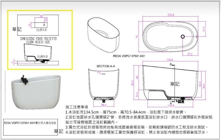 義大利REXA DIP 霧白人造石浴缸(135cm) VDPC137501-K01 尺寸圖