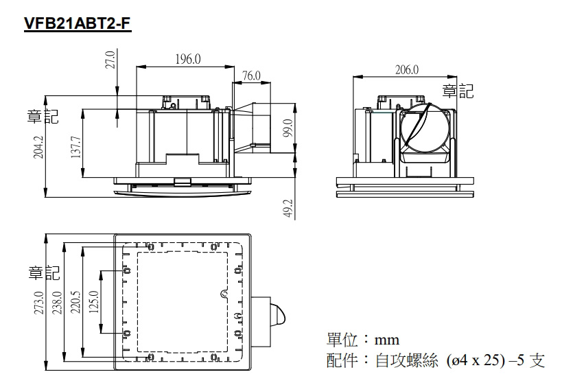 台達DELTA DC直流節能換氣扇 VFB21ABT2-F 尺寸圖