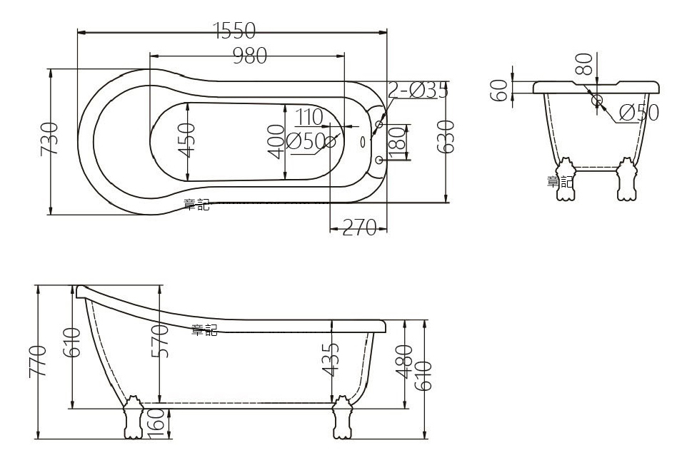 CBK Sandro 壓克力獨立浴缸(155cm) YSC501 尺寸圖